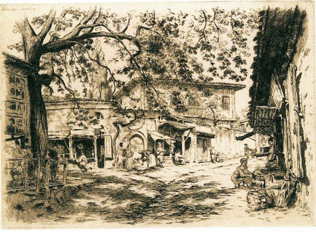 Μέσα στον κύκλο βρύση στην περιοχή της Αρχαίας Αγοράς. Δεξιά ο ναός του Αγίου Νικολάου του Τρανού. Σχέδιο του Murhead Bone 1917.